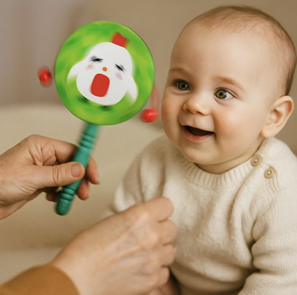-12 meses: ¡El hermano mayor es el star! Lo usa para arrullar y entretener al bebé con su sonido suave y movimiento relajante. Un primer acercamiento supervisado que fortalece el vínculo entre hermanos.